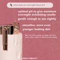 Overnight Facial 11% Triple Acid Resurfacing Serum is an 11% percent vegan acid serum that is clinically proven to exfoliate skin overnight to reveal dramatically smoother, softer, more luminous skin in the morning.