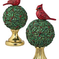 Standing at 9.5" and 11" tall, these beautifully crafted resin topiaries feature vibrant red cardinals perched on holly-covered orbs adorned with intricate leaves and festive red berries.