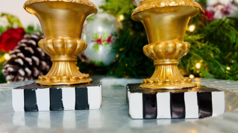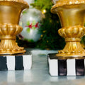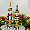 Each topiary features a stately nutcracker adorned in bold black and white harlequin patterns, accented with gold details and rich red trim.