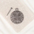 • 3.5" antique silver Benedictine Medal with rustic nail designed exclusively for My Saint My Hero