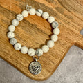 This beautiful 10mm White Howlite, which is a beautiful white stone.  The stone representing the spiritual qualities of stillness, tenderness, and open-mindedness.  It also features a silvertone charm with an embossed heart.