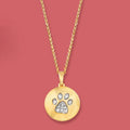 Show off your pride for your beloved pet when you sport this adorable pendant necklace. Diamond accents in the shape of a paw print are set in a polished 18kt yellow gold over sterling silver circle disc.