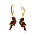 A good omen, nestled right inside your jewelry box! Our charming cardinal drop earrings are adorned by .80 ct. t.w. round and marquise garnets that sparkle in the bird's signature red hue. Finely crafted in polished 18kt yellow gold over sterling silver. Black enamel. Black rhodium. Hanging length is 1 3/8".