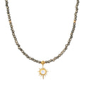 The Universe is ready to bless you with abundance; trust your dreams to map your journey to prosperity. A choker necklace of gleaming pyrite—stone of reflection, prosperity, and clarity—shines with a golden starburst of moonstone, stone of intuition, passion, and good fortune. Wear this gemstone choker necklace alone, or part of your layered necklace look to manifest prosperity in your life.