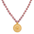 As our spirits evolve, our inner light grows more luminous, shining its beauty out into the world. 108 beads of rhodonite--stone of inner growth and healing--create this mala, or ancient prayer necklace. Anchoring this mala is an intricate 18KT gold plate mandala, meaning "circle" in Sanskrit. This spiritual symbol represents the Universe, the infinite cycle, and sacred connection of all things. Wear this mala as a meaningful necklace, or use it to help you focus during meditation.
