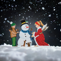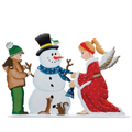 This figurine tells a story of kindness, as an angelic figure tenderly assists a little boy in building his snowman.