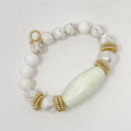 This beautiful 10mm beaded bracelet features creamy white Howlite beads along with a centerpiece of Citron Agate accented with goldtone Rondels.  It sure does make a statement!  Please note that these statement bracelet will have a snugger fit to ensure that the center piece barrel stays on top of the wrist.